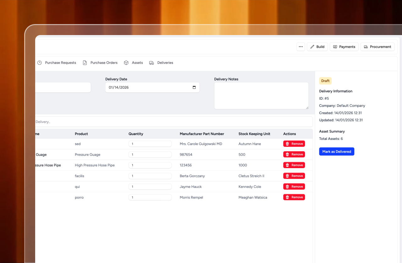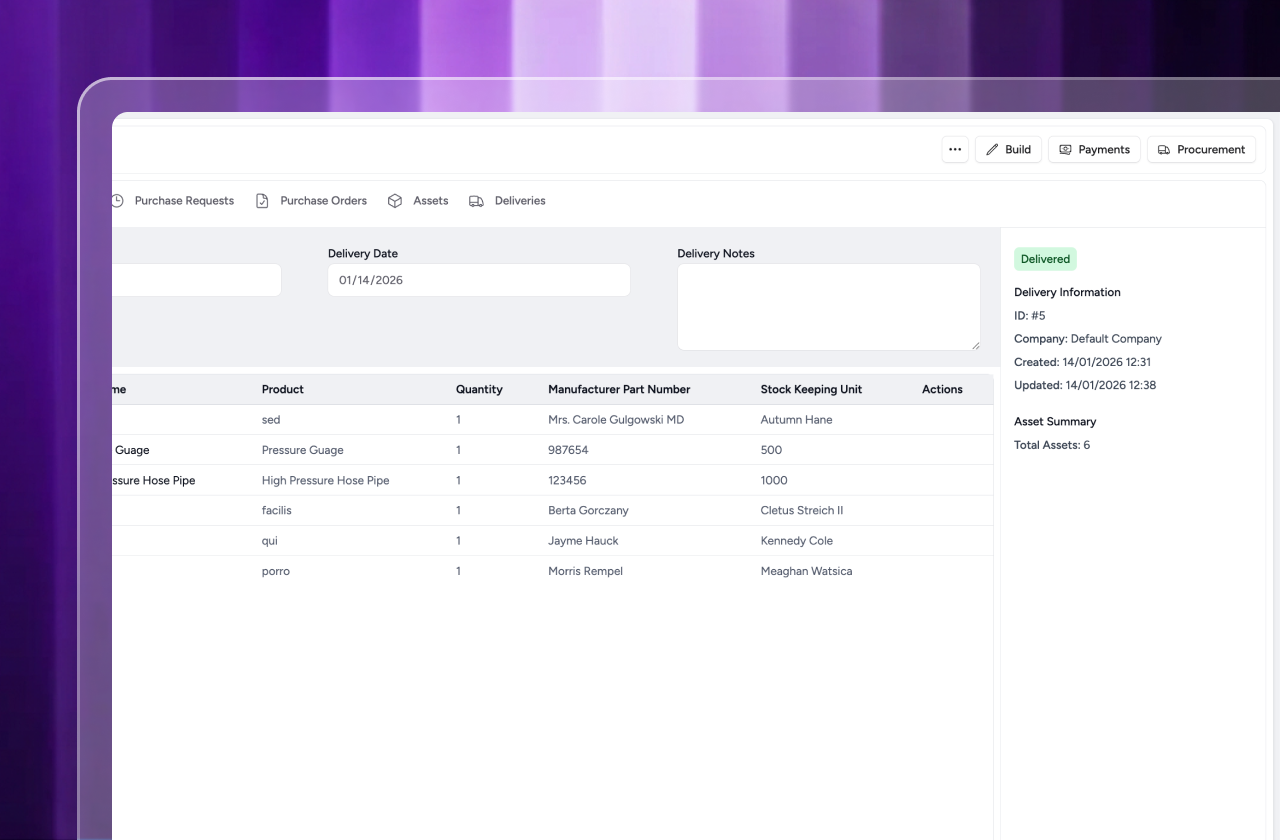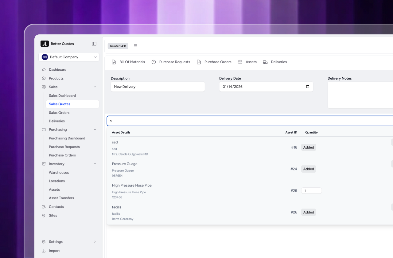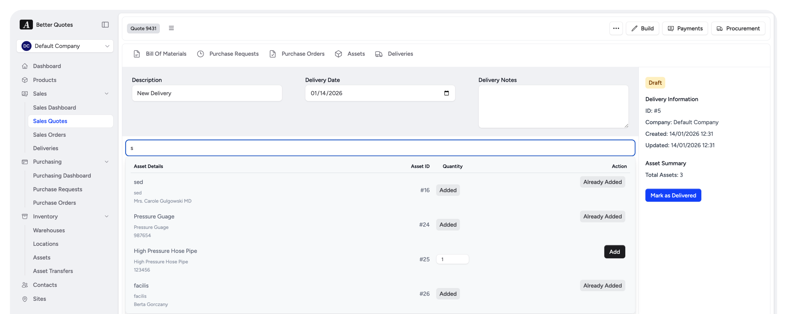 Manage deliveries from quotations or custom inventory while maintaining accurate procurement and delivery control.
