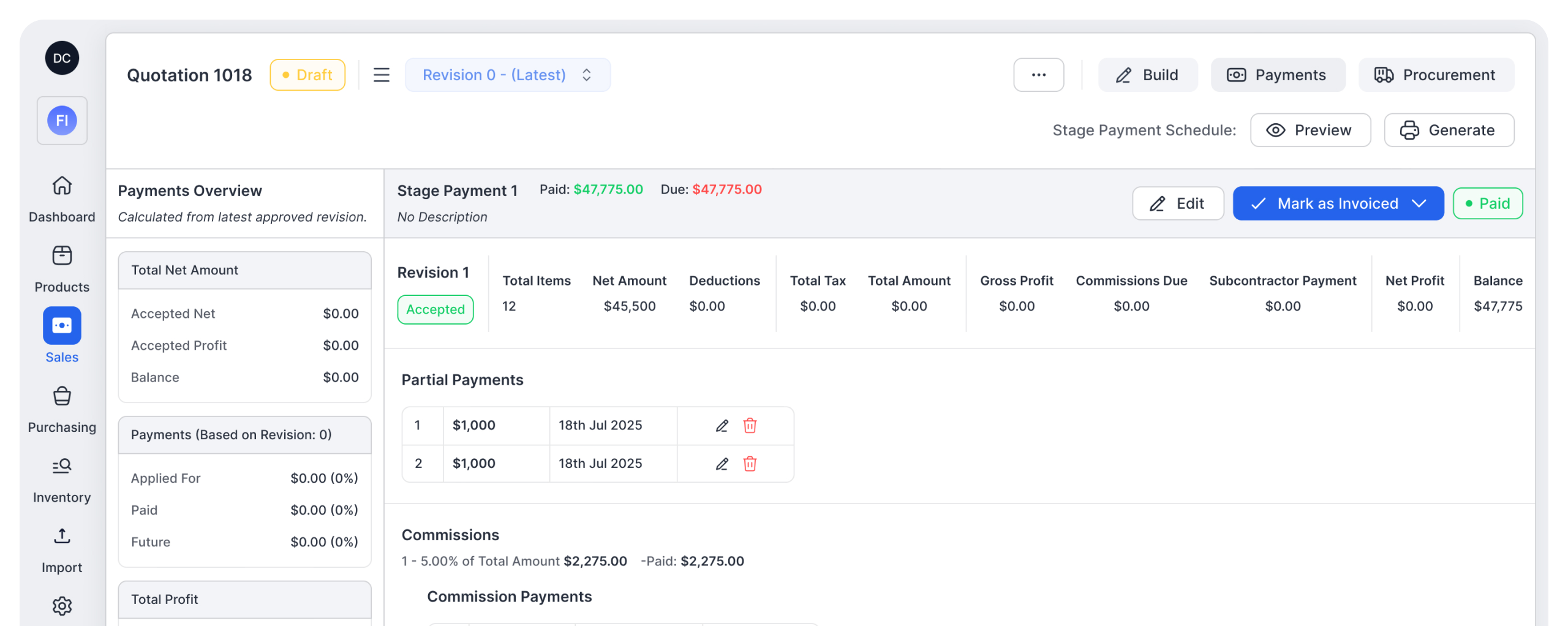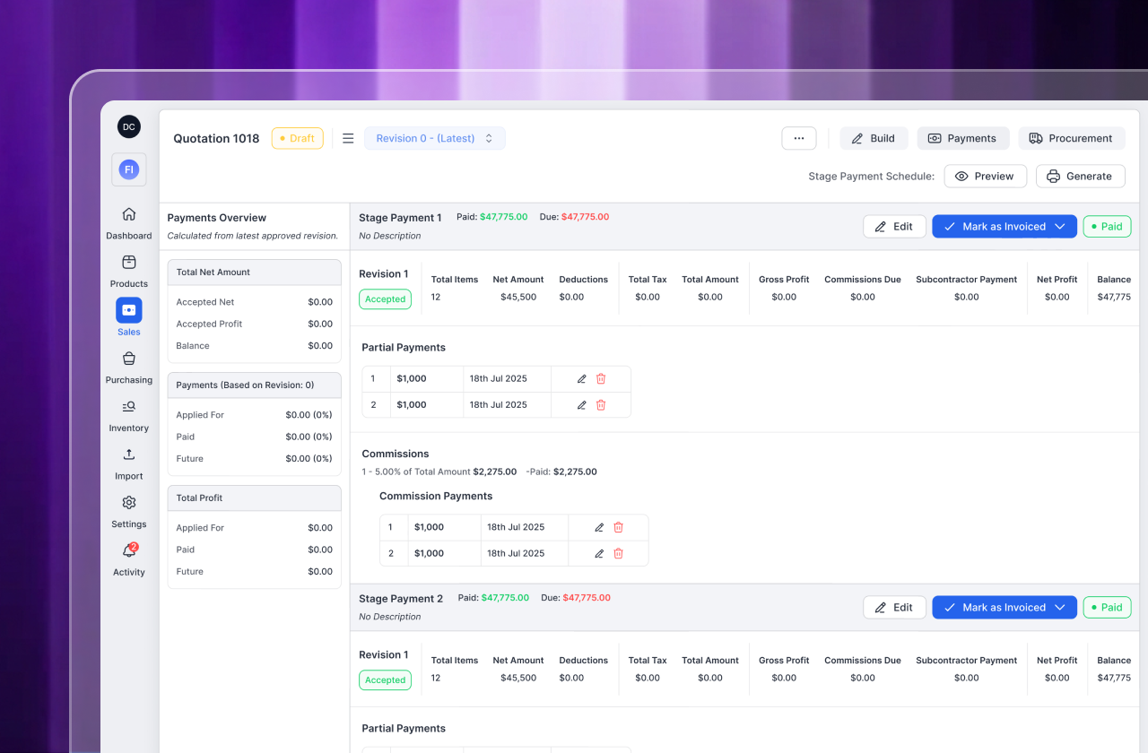 Manage staged payments with real-time adjustments, commissions, and transparent tracking across every invoice lifecycle stage.